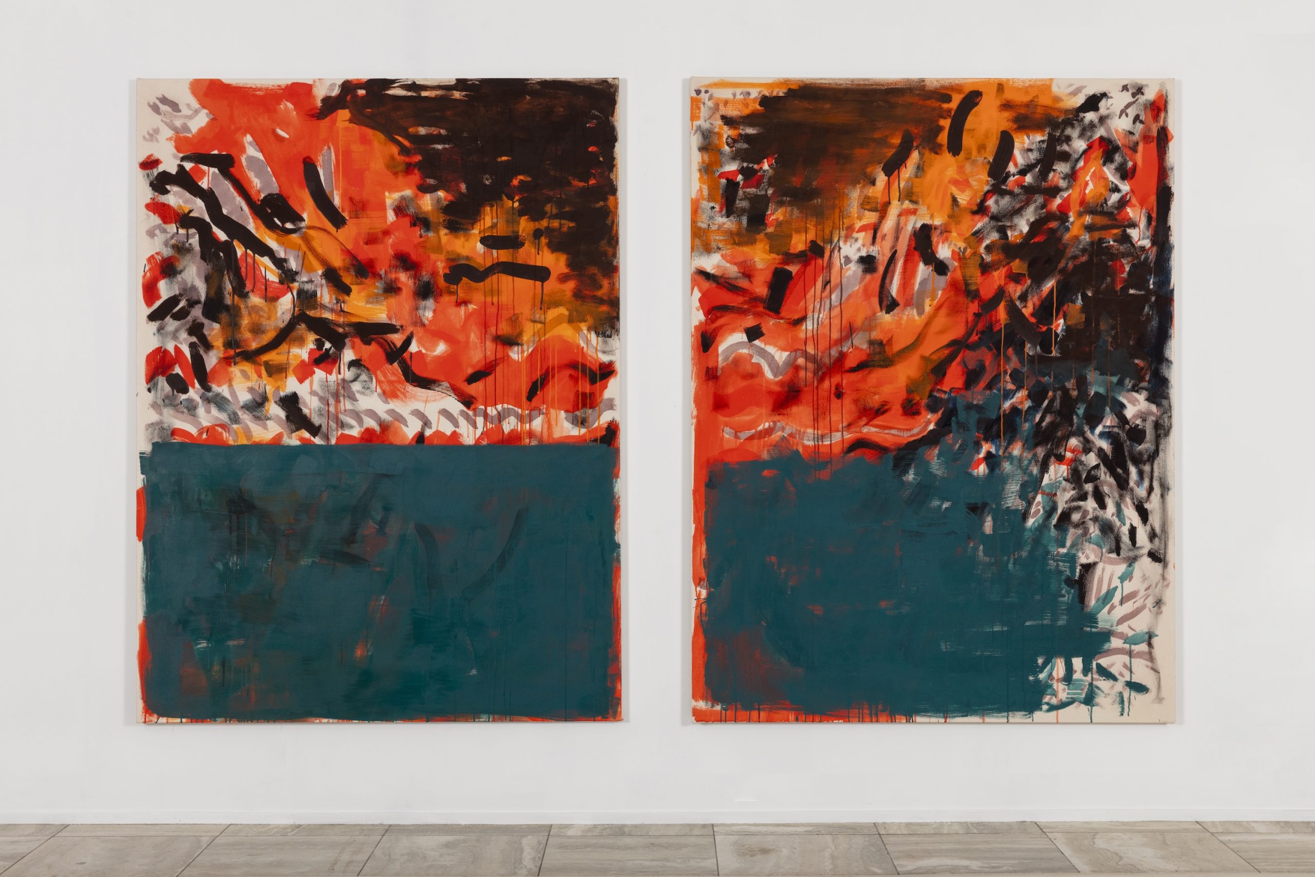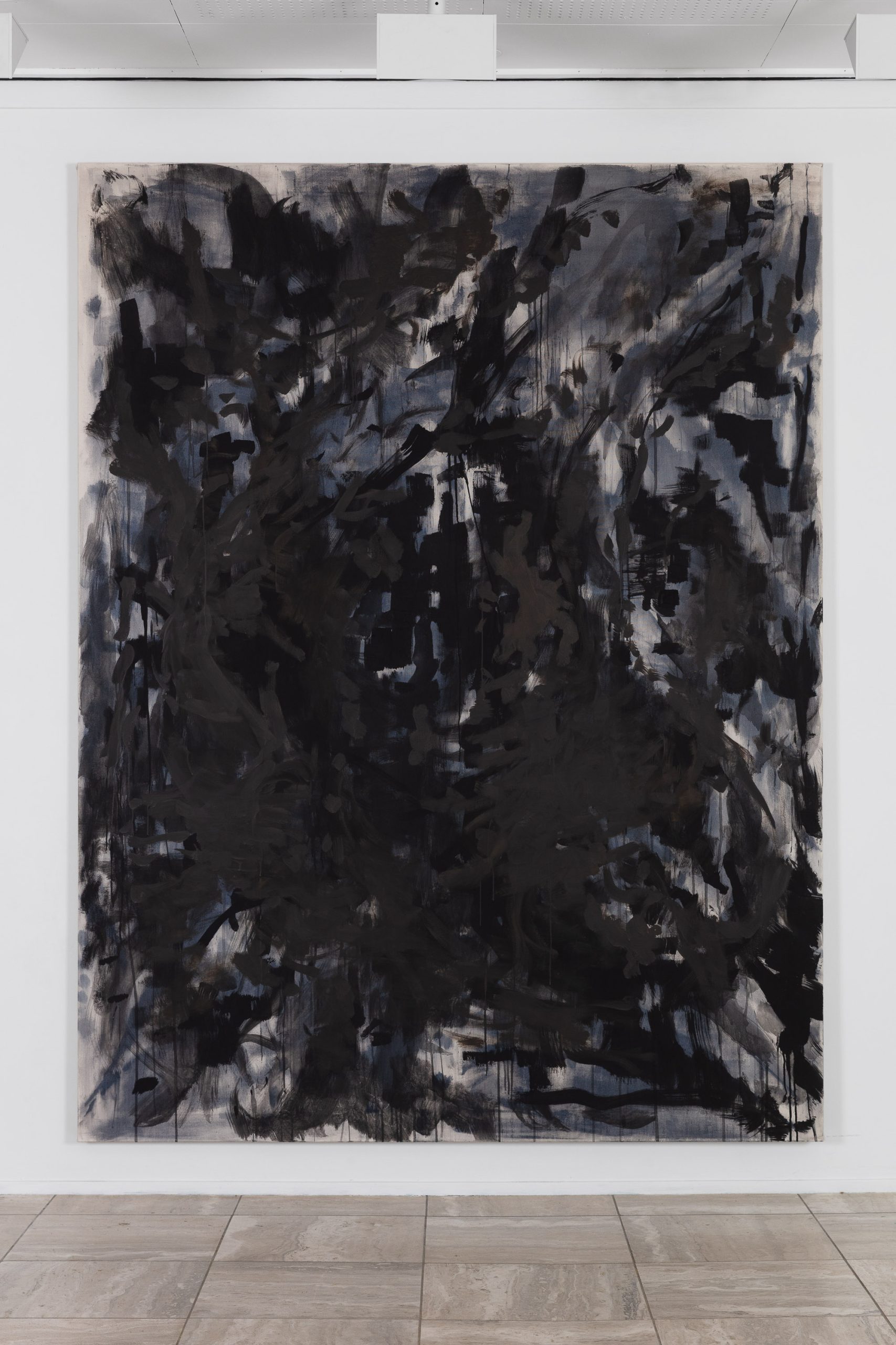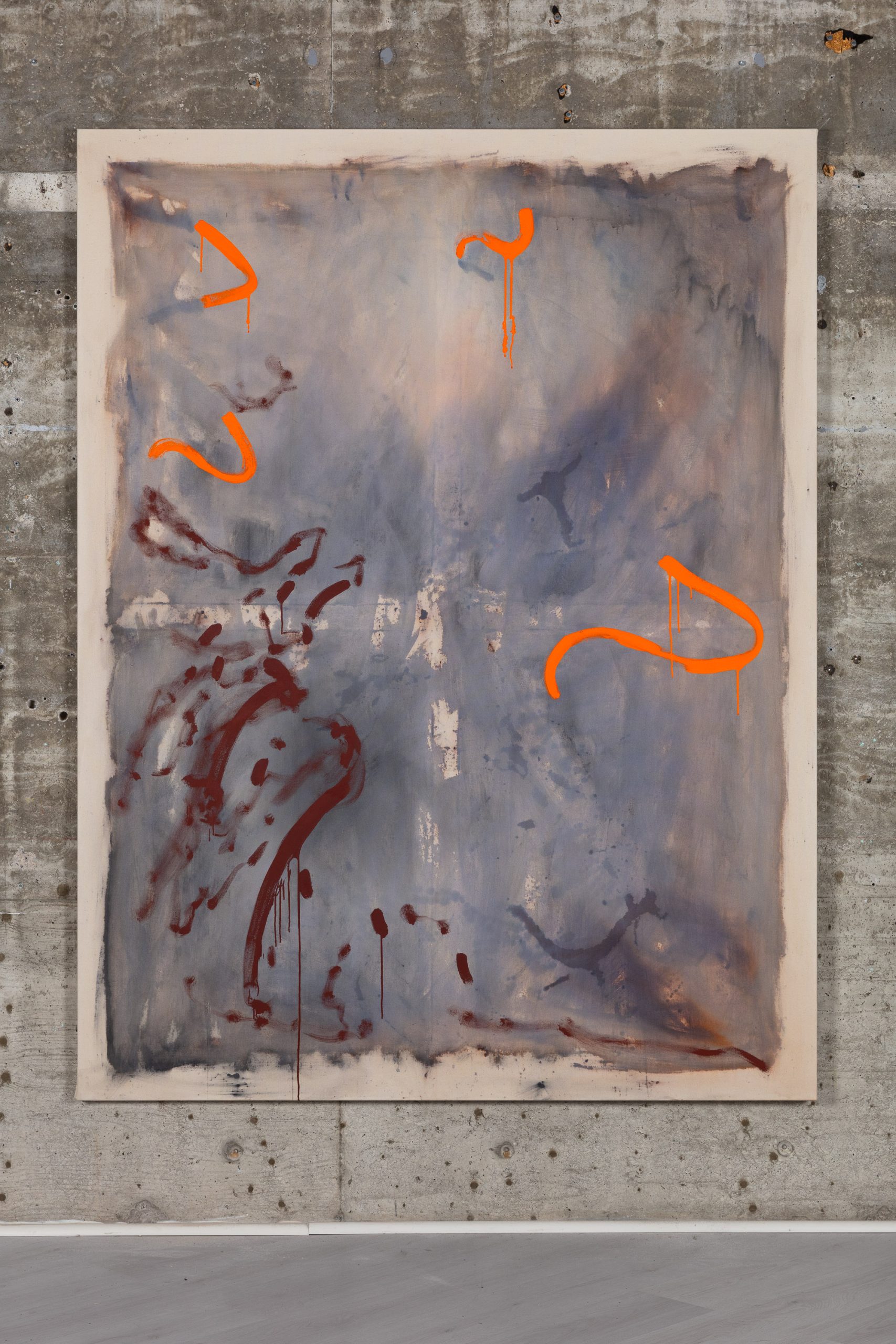 An aura is an invisible field of light or energy surrounding living beings. In medical terms, it refers to a premonition or warning sign, often preceding an attack, such as a migraine. Through a multifaceted painting process involving ink, watercolor, various glues, egg tempera, and oil on canvas, Inga Sund Hofset explores this mental state of underlying pressure, where light bends, language falters, and signs begin to shift.