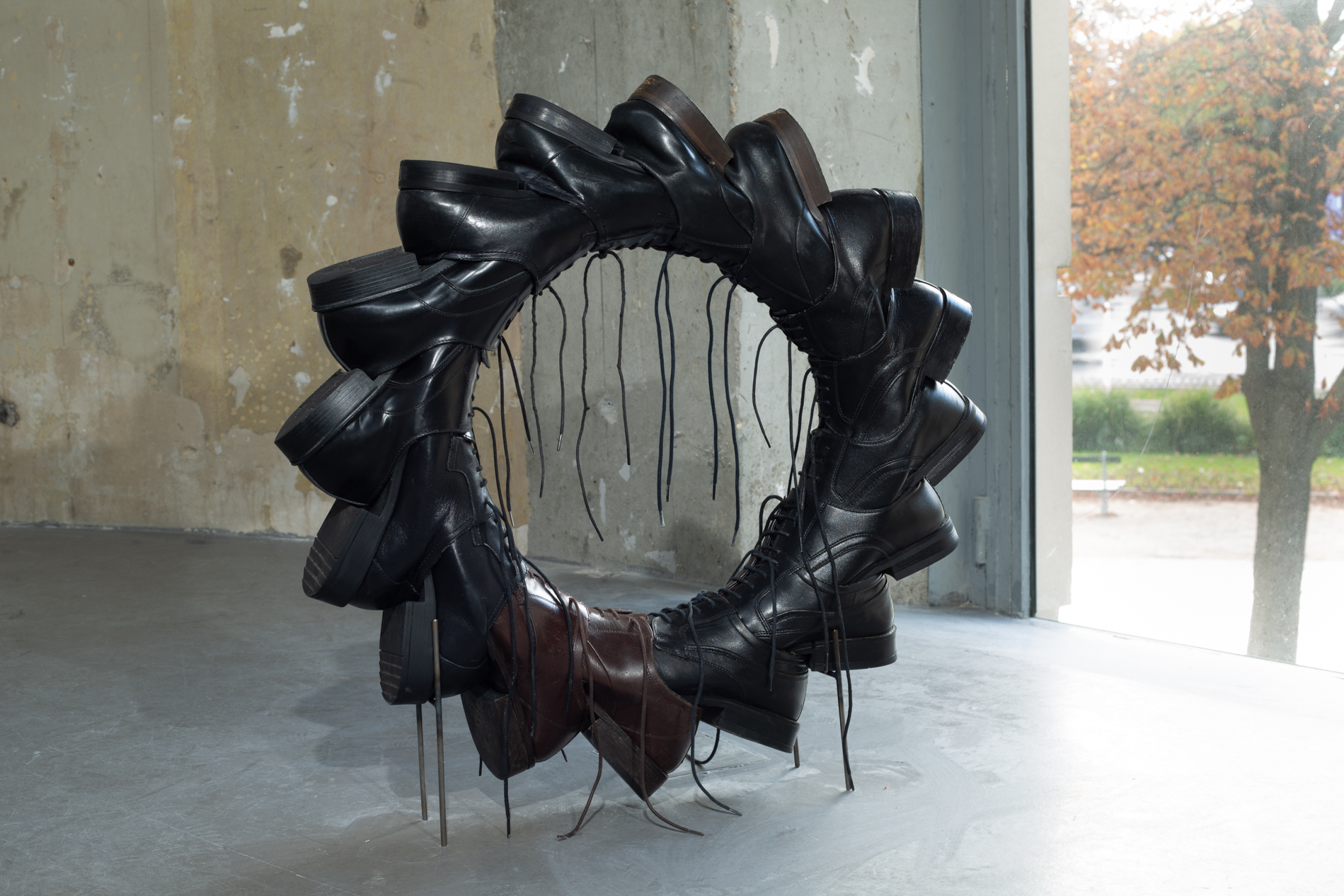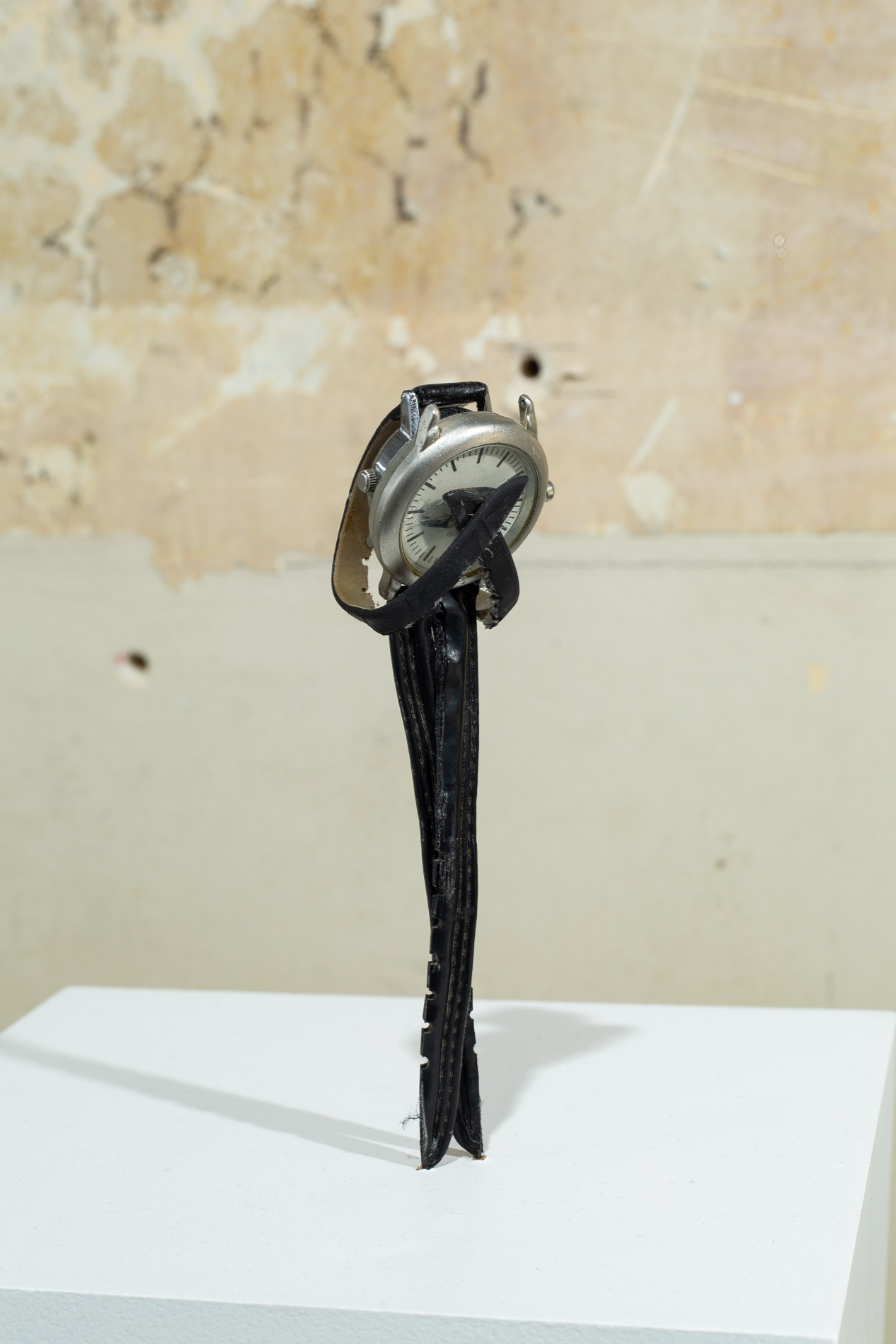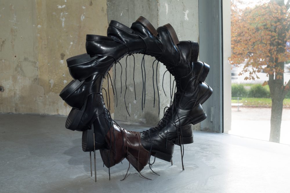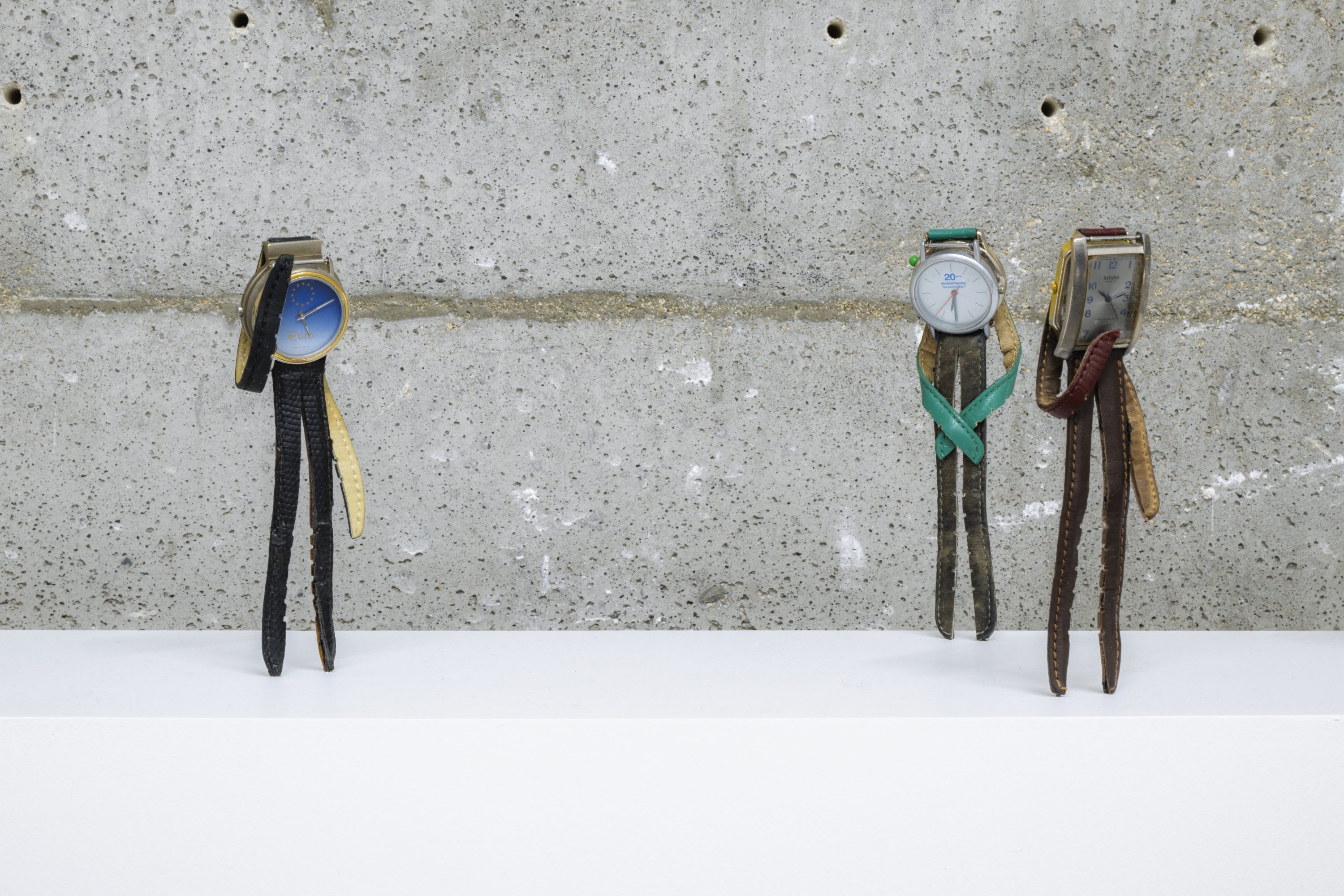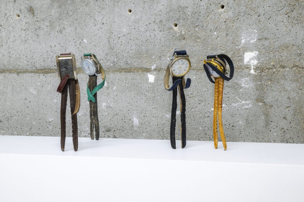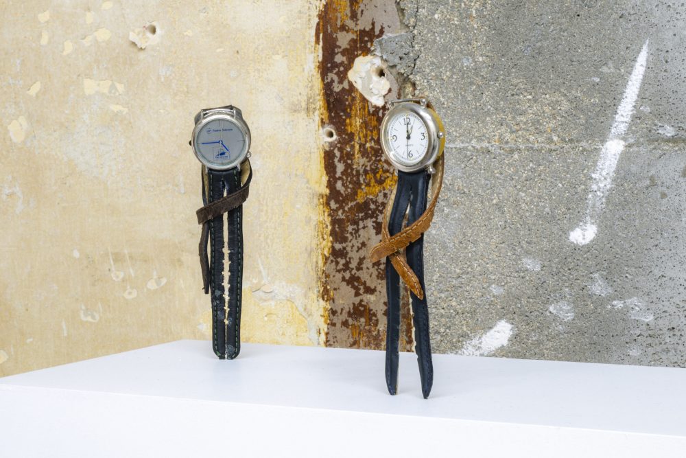 Complementing the photographic works are sculptural pieces made from watches and shoes, transformed into configurations that hover between the personal and the universal. Wristwatches, sourced from Paris flea markets during Ruud’s residency at Cité Internationale des Arts, are assembled into bodily forms, suggesting figures intertwined in symbiotic embrace or caught in monogamous echo chambers. This act of fusion continues in Ruud’s sculptures made from men’s leather dress shoes, pressed together to form wheels, suggesting power spinning endlessly, trapped in its own motion.